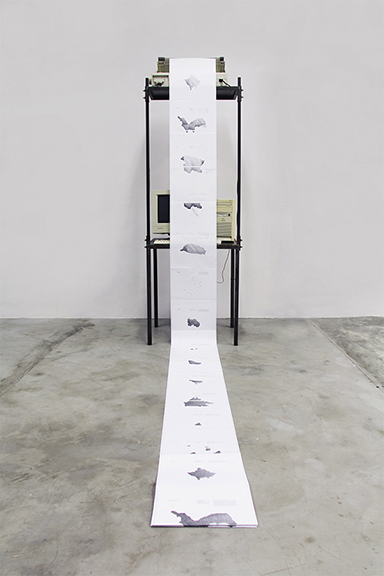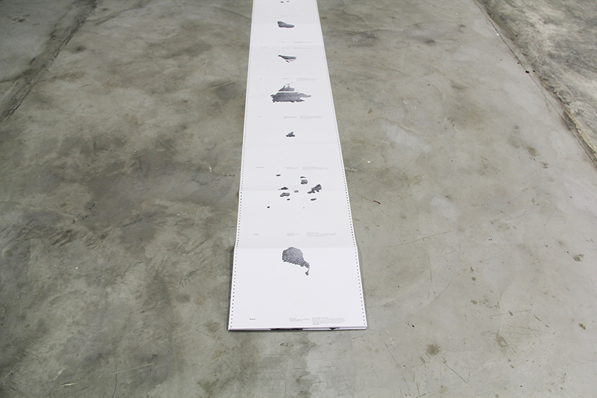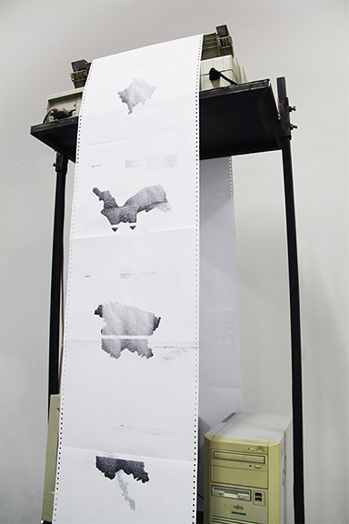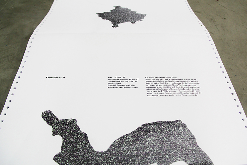 Lands of Progression (exhibited at Lit Up Festival 2013) was derived from the frequency in which national progression is used to justify economic-driven interests and coordinate collaboration for expansionist efforts. A dated computer produces a continuous data sheet of lands around the world under territorial dispute. The dot matrix printer, often used for printing financial transactions, suggests a lust for material success and power underlying these efforts rather than meaningful noneconomic progress.