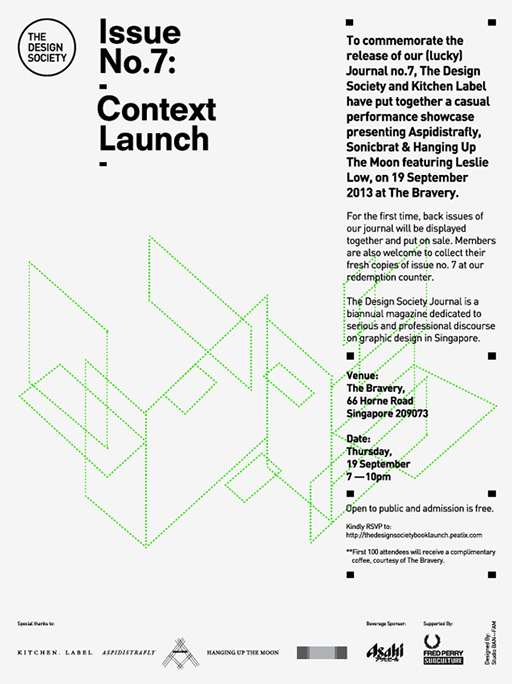 Based on how a frame contextualizes a piece of work, the visual metaphor of a frame is stripped down to it's bare essence — a rectangular form, and the points of debate are represented by each frame touching another in various angles. Designed for the launch of The Design Society's Journal No. 7 : Context.