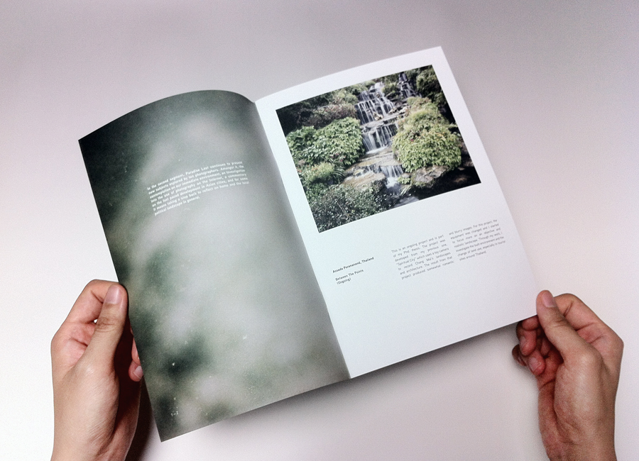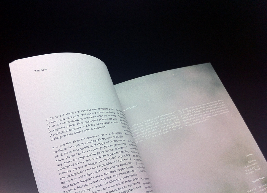 Paradise Lost is an exhibition catalogue featuring artists in a yearly themed photography exhibition by 2902 Gallery, focusing on the notion of 'A Paradise Lost'. An abstract image, suggesting the notion of a universally understood 'natural paradise', was shot for the front cover.