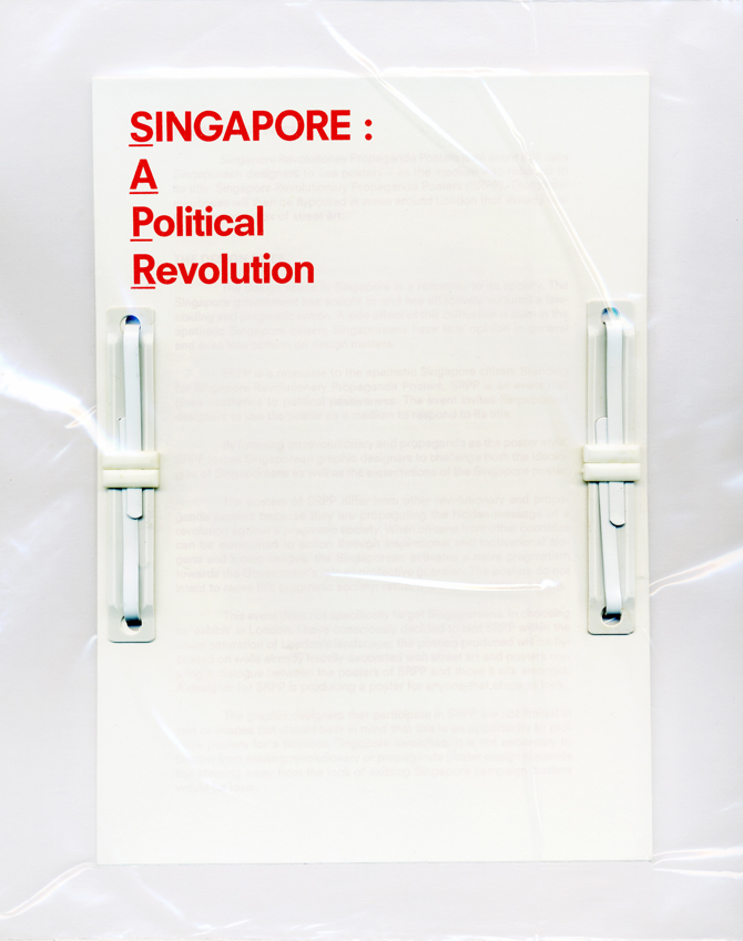 Singapore: A Political Revolution (S:APR) is part 1 of my response to a brief written by Andrea Fam about challenging graphic designers to respond to the lack of political posters in Singapore. The publication, featuring the brief, interviews, and research, is bound twice and sealed tightly in a vacuum pack.